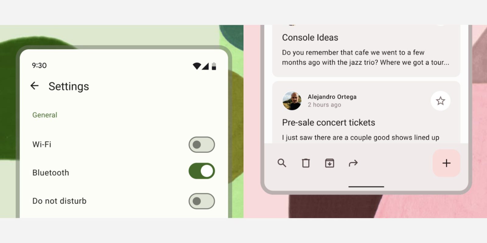 Meant for showing navigation and other key actions, bottom app bars are now taller as a result, while there’s no longer any shadow (for elevation) and the element is compatible with Dynamic Color.