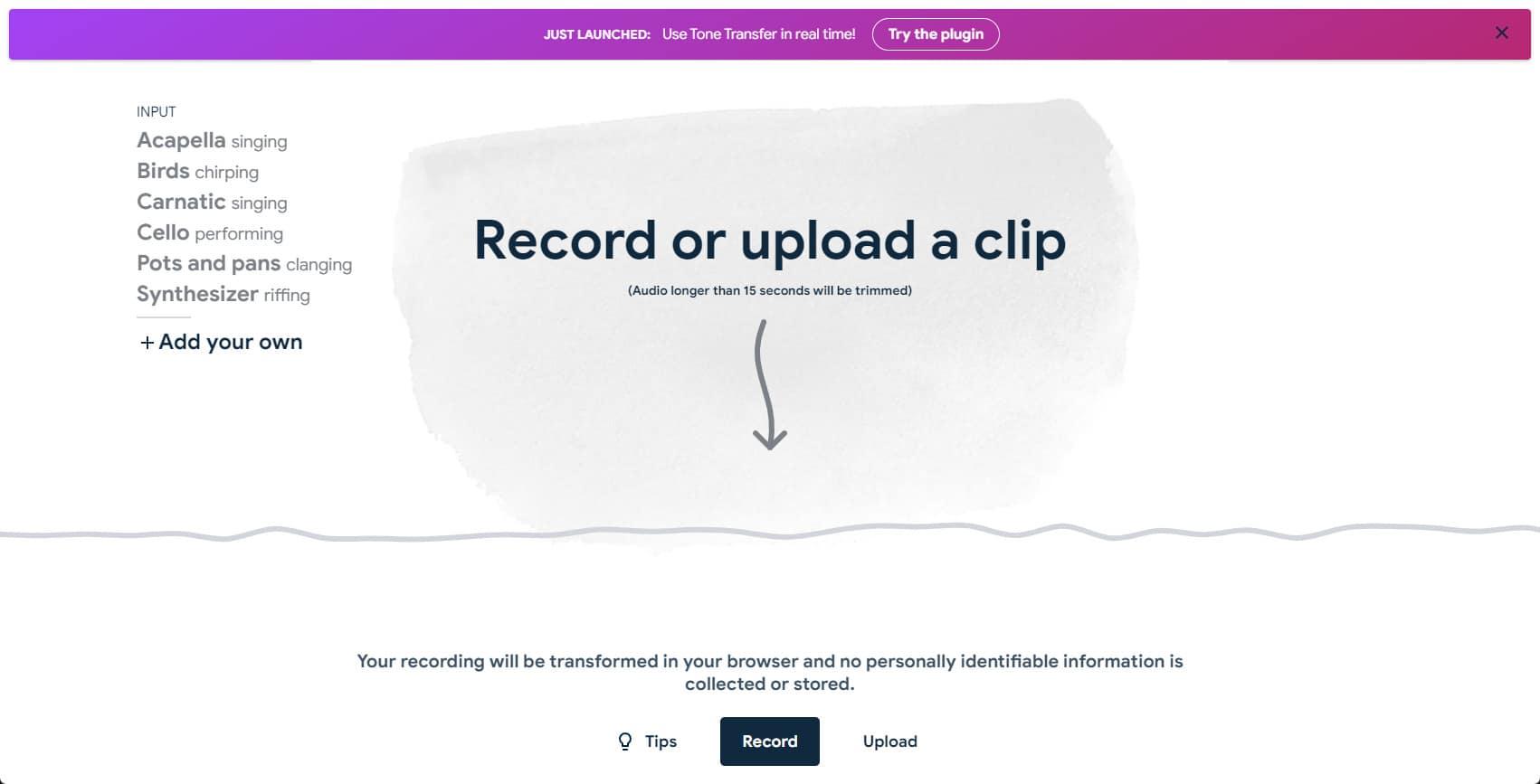 If you want to upload your own sound sample, you can hit Add your own under the source sample section. If your device is compatible, you can either record a sound or upload a file from your computer. Once you’re done recording or uploading, hit Done and you’ll be able to listen to your recording. If you’re happy with it, hit Transform, and Tone Transfer will start to process the sample.