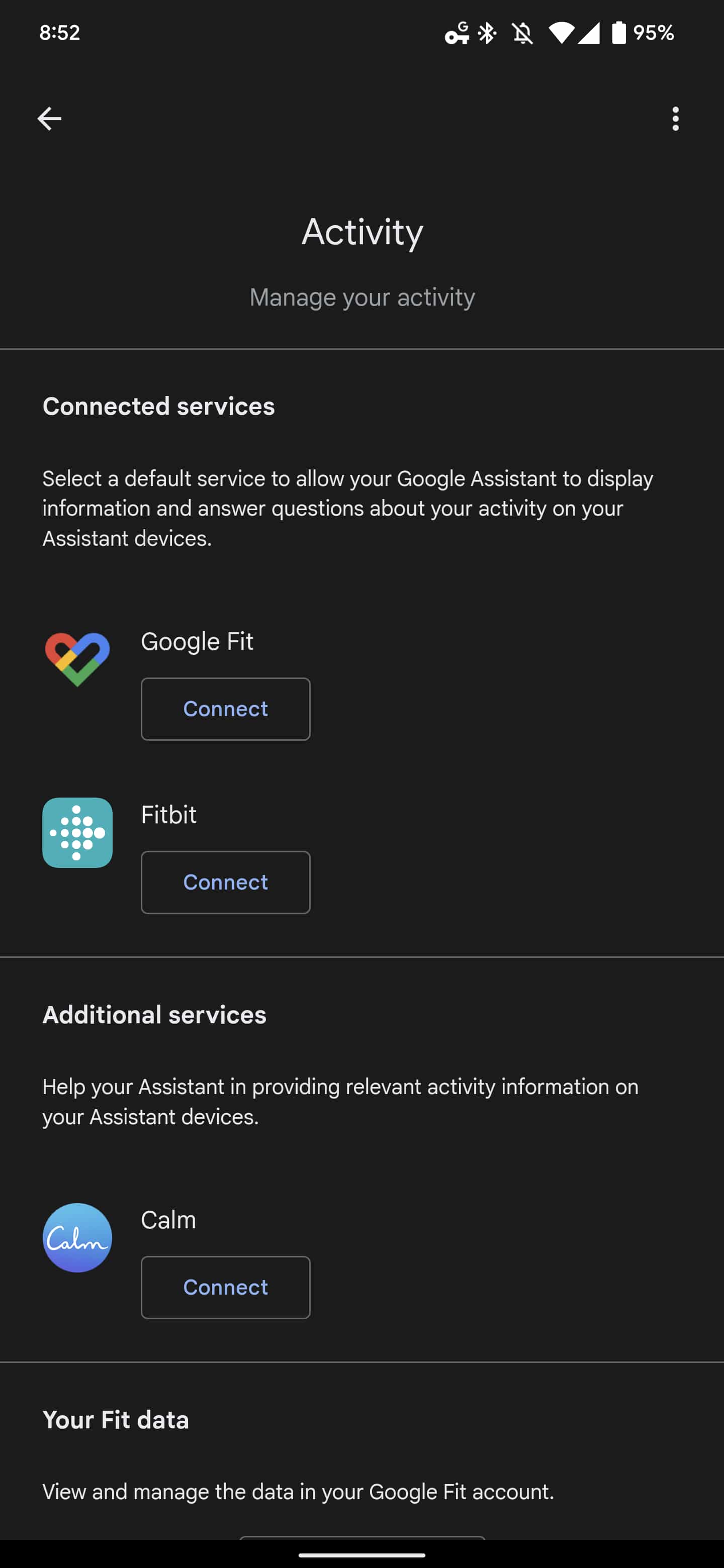Compared to the start of this month, visiting Assistant settings > Wellness > Activity lets you connect Google Fit and/or Fitbit. [Update: This is not yet widely rolled out and most people just see Calm.]