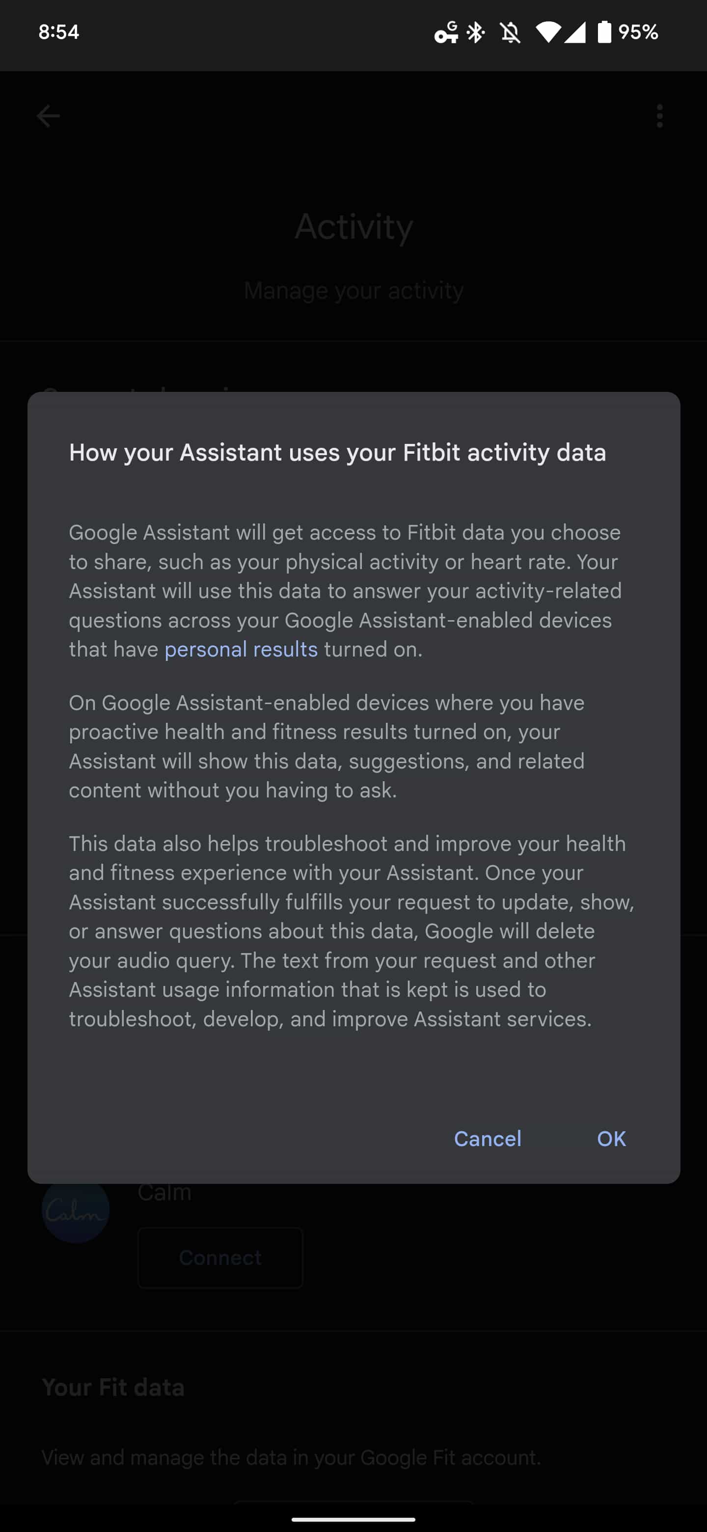 After an explanation of how Assistant will use your activity data, you’ll be taken to your Fitbit account to allow access to “heart rate” and “activity and exercise.” Google’s service has three categories: