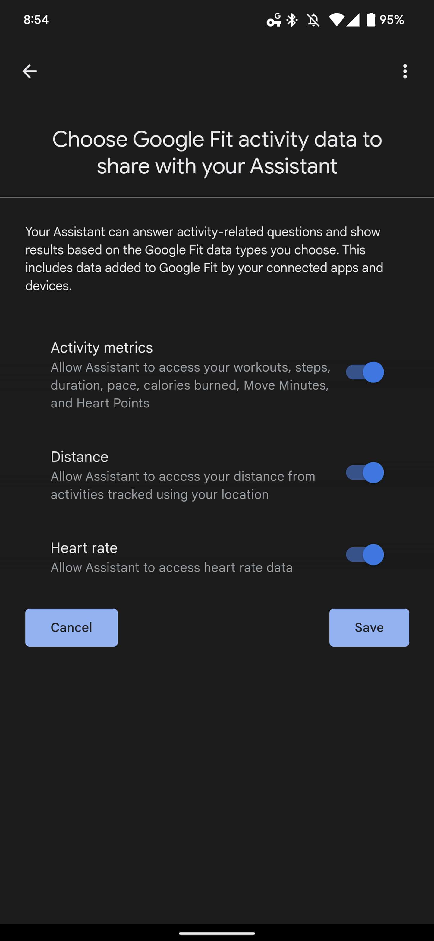 - Activity metrics: Allow Assistant to access your workouts, steps, duration, pace, calories burned, Move Minutes, and Heart Points