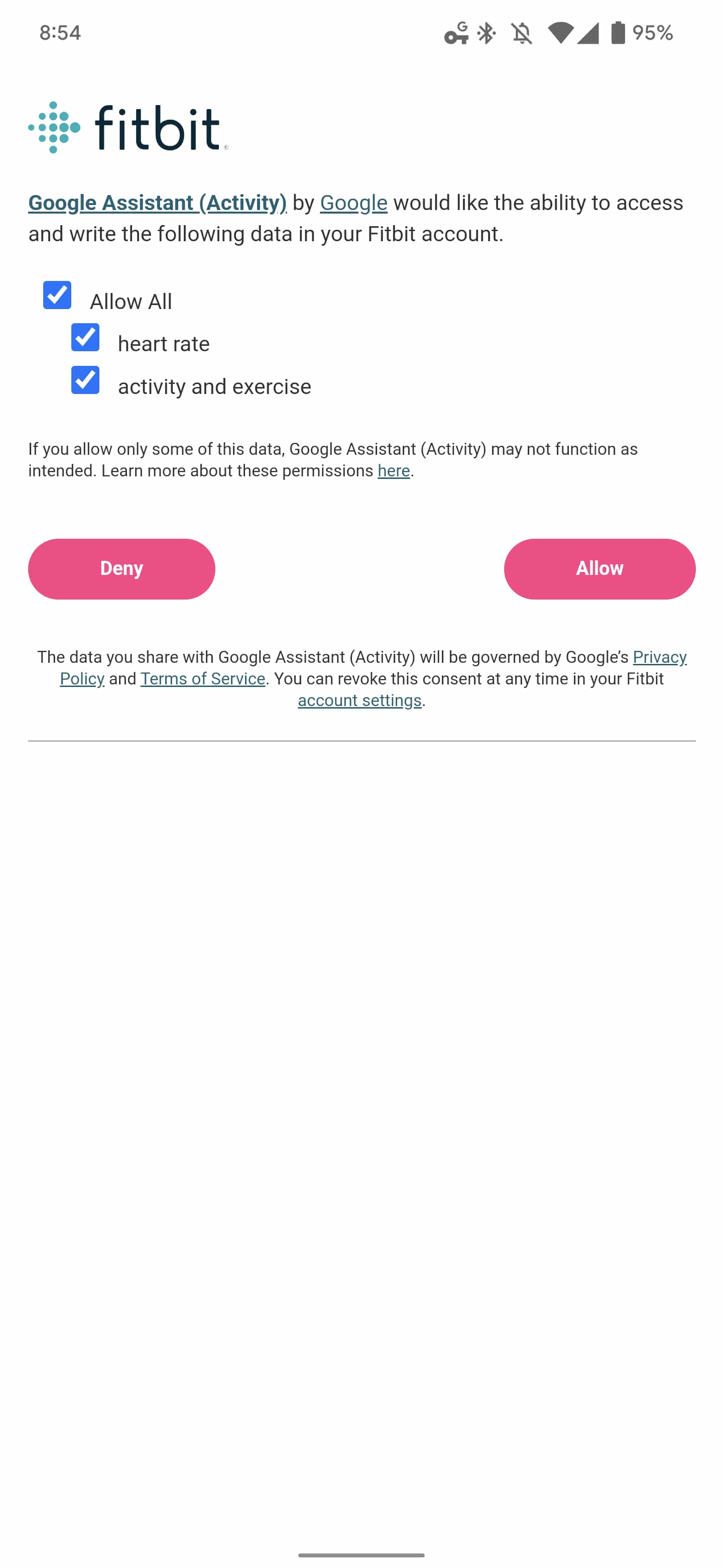 After an explanation of how Assistant will use your activity data, you’ll be taken to your Fitbit account to allow access to “heart rate” and “activity and exercise.” Google’s service has three categories: