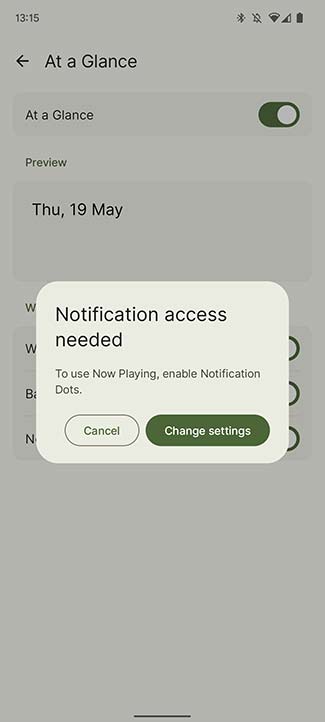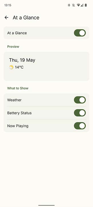 Sadly, it doesn’t appear to include support for the full plethora of options that are available on the Pixel Launcher including Stopwatches and Timers, Bedtime, Fitness app, Connected devices, Safety Check, or Earthquake alerts. Lawnchair 12.1 Alpha lets you choose if you want to see Weather, Battery Status, and Now Playing information from the At a Glance widget. Alternatively, you can just disable it entirely: