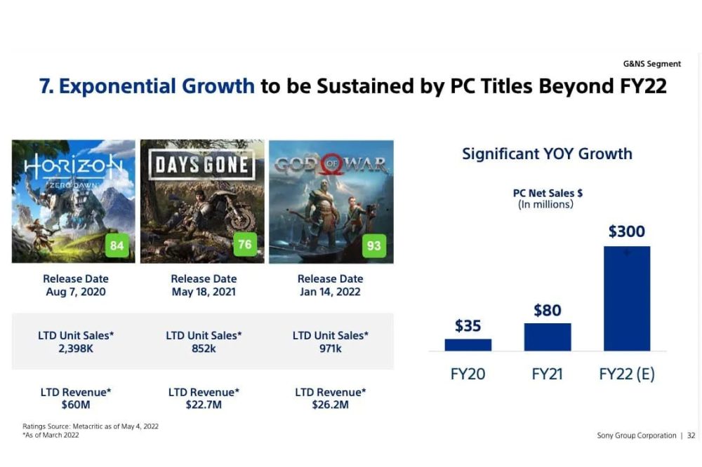 Sony has seen quite a bit of success in expanding its games to PC, with ports of Horizon Zero Dawn, God of War, and Days Gone generating around $80 million in sales in 2021. Sony believes that PC games will generate up to $300 million this year. Last July, Sony doubled down on this goal by adding a PC porting developer to its PlayStation Studios.