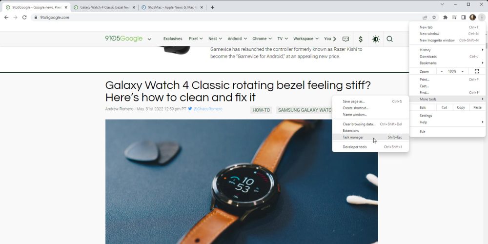 - Hit Shift + Esc (Windows) or the three-dot menu at the top-right, followed by hovering over More tools and clicking Task Manager.