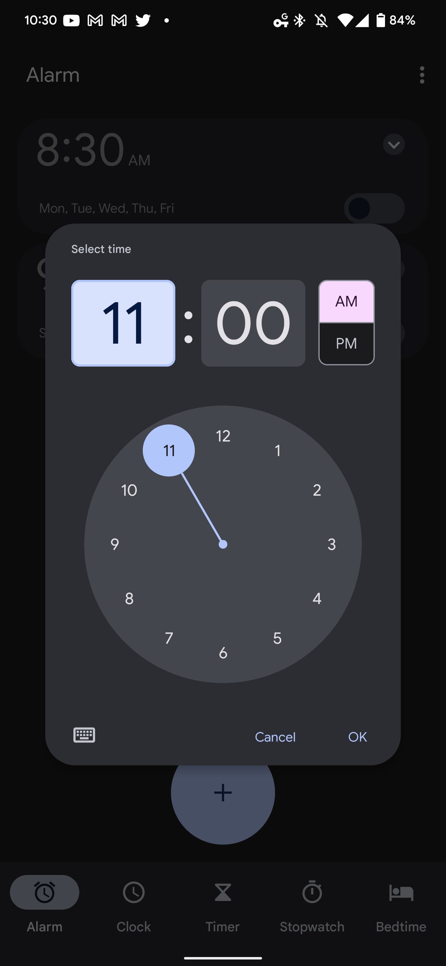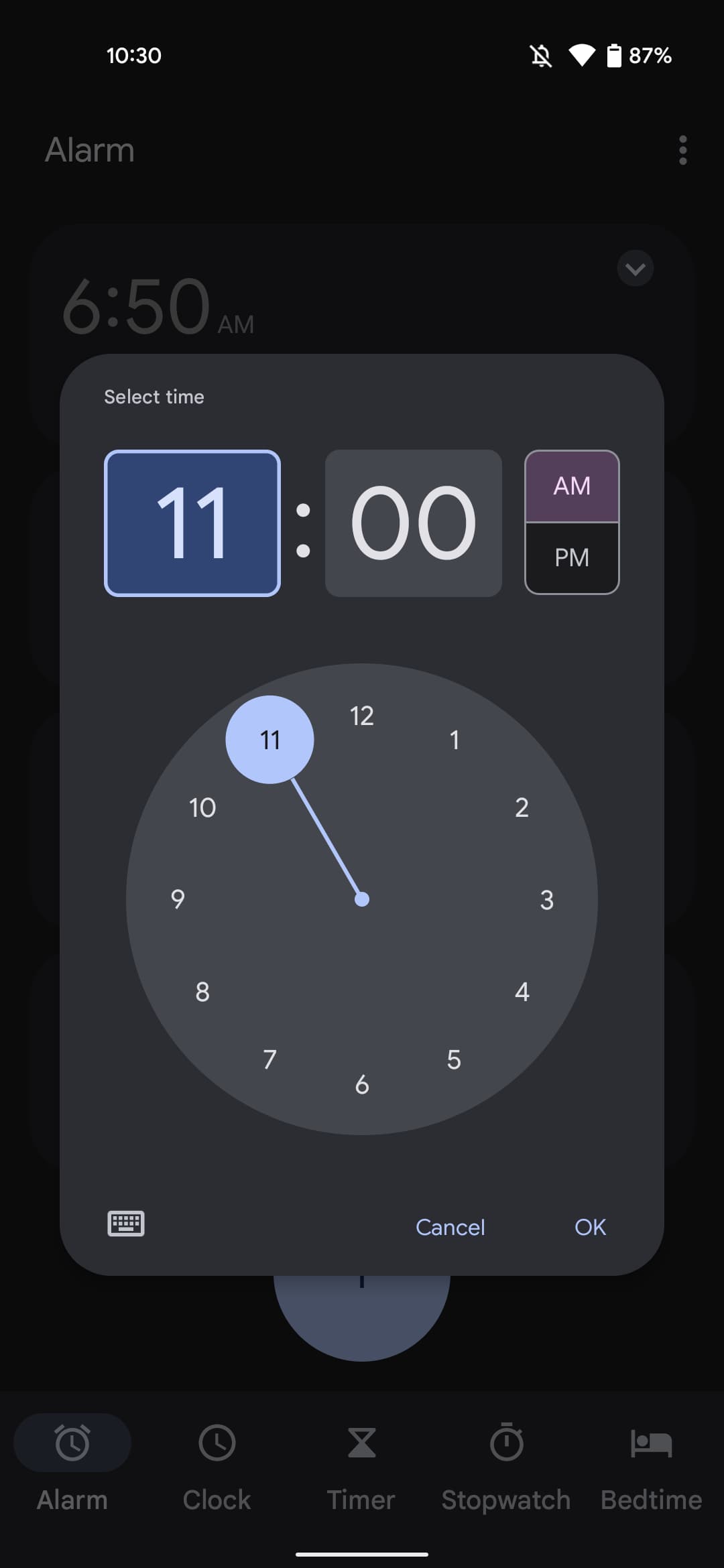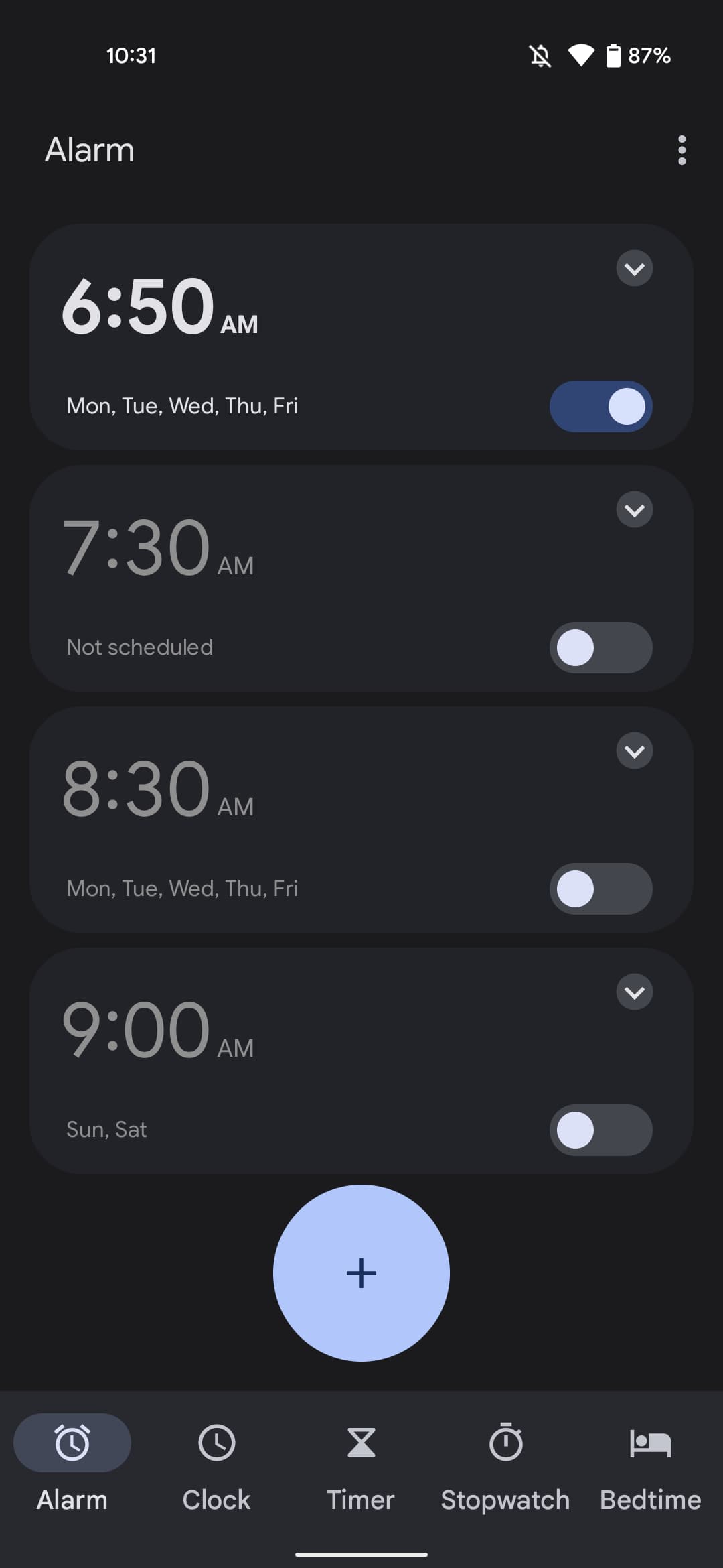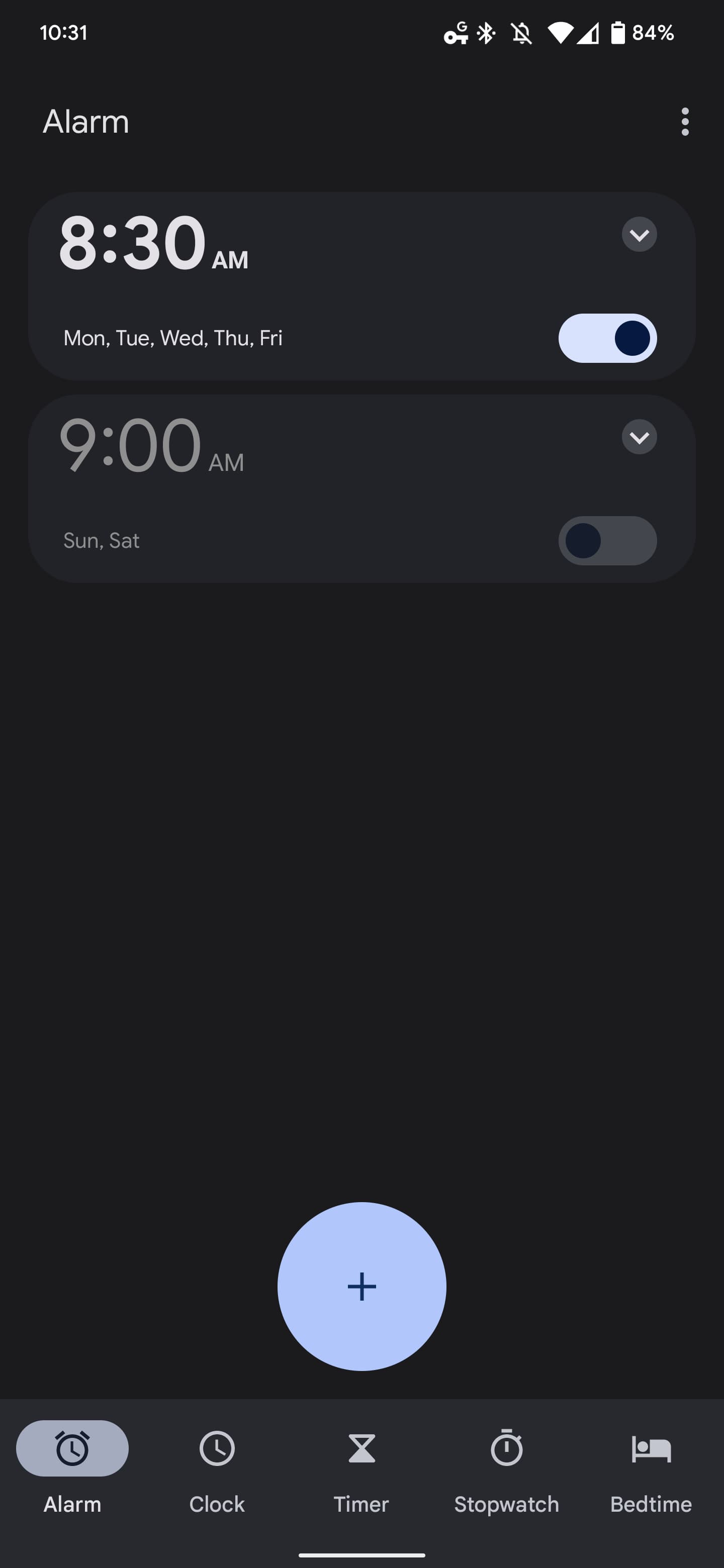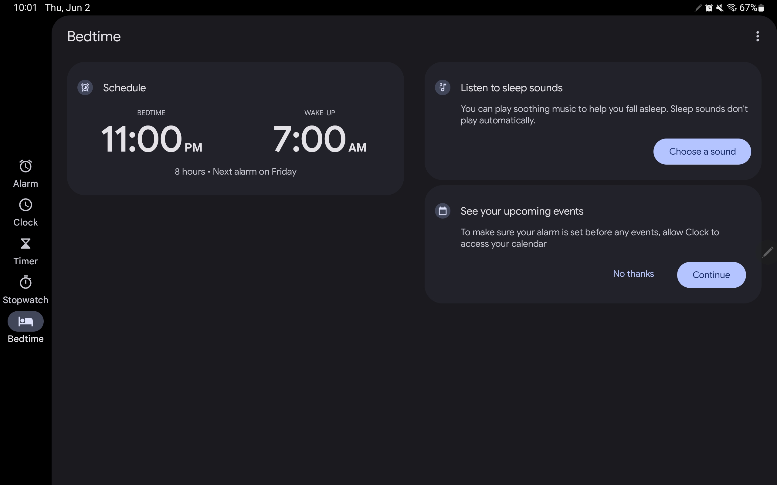 - Alarm tab: Bedtime prompt/card and lists of set alarms