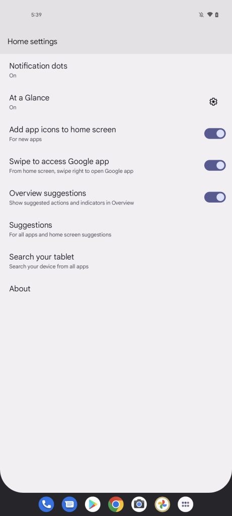 The “Home settings” for Pixel Launcher also ditches the “Allow Home screen rotation” toggle and changes the “Search your phone” heading to “Search your tablet.” Meanwhile, back in the Wallpaper & style settings, you will no longer find an option for your app grid size. This suggests that Pixel tablet owners will only be able to use the new 6×5 grid.