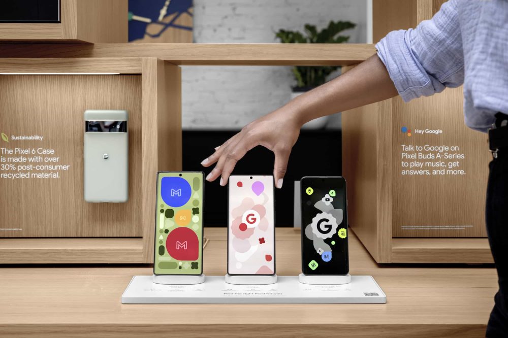 Front and center (literally) is a table with the entire Pixel phone lineup — arranged in groupings of three. In fact, the “Phones & Earbuds” section, which has about five surfaces in total, is the first thing you encounter as you walk through the store. Some of the phones are displayed alongside Fitbit wearables, and the Pixel Watch will presumably play a greater role in the future. There’s also a smaller wall of phone cases at the right side.