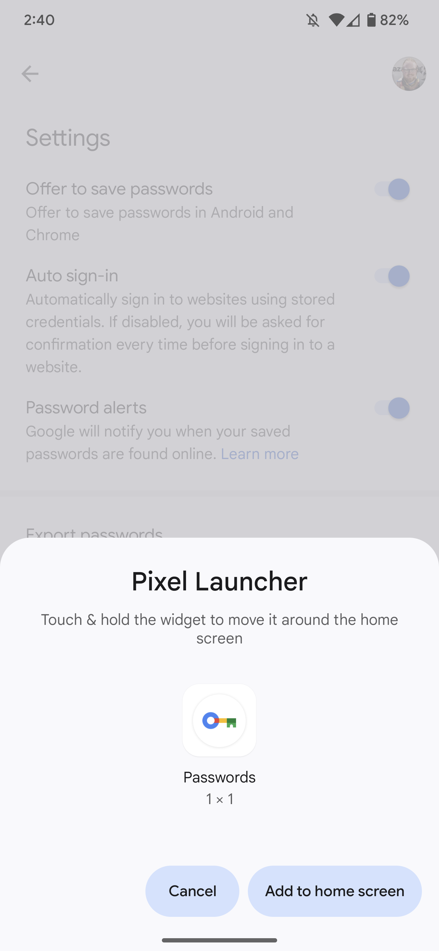 Next, open Password Manager again, as laid out above, then tap the gear icon in the top-right corner of the applet to view the settings. On this page, you should see a new option to “Add shortcut to your home screen.” Tapping this will pop open a handy menu with the shortcut, which you can then drag to your desired location on your home screen.