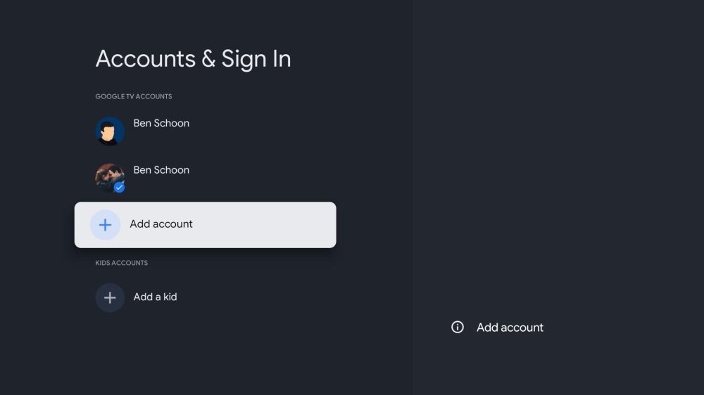 It’s worth noting here that, with the arrival of proper Profiles, this page has seen a slight redesign. Gone is the “other accounts” section at the bottom of the screen, with everything now under “Google TV accounts.”