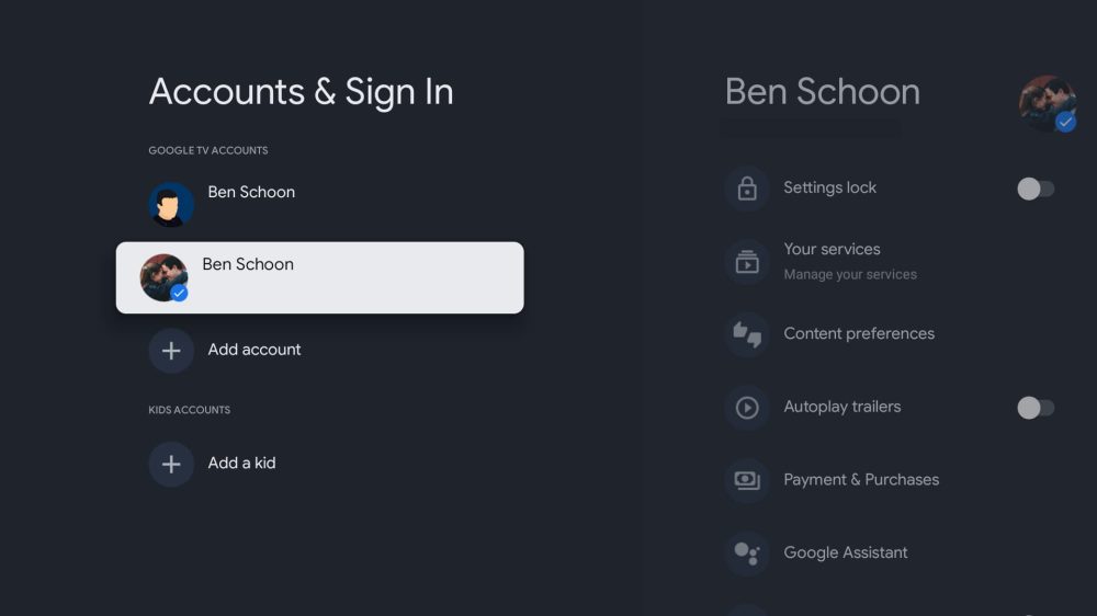 It’s worth noting here that, with the arrival of proper Profiles, this page has seen a slight redesign. Gone is the “other accounts” section at the bottom of the screen, with everything now under “Google TV accounts.”