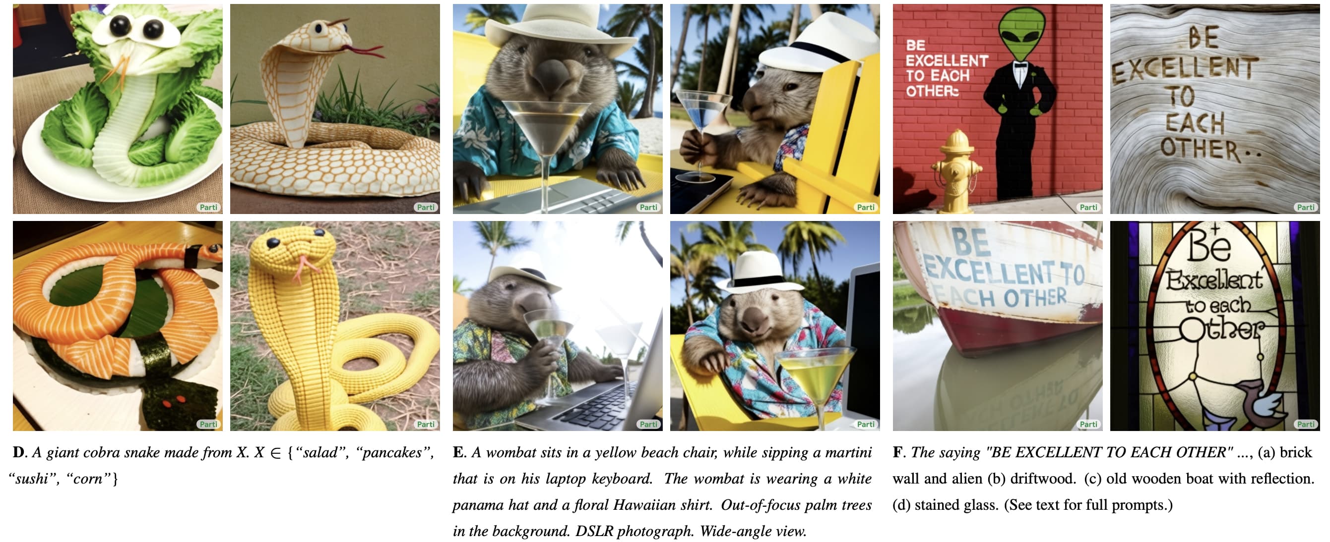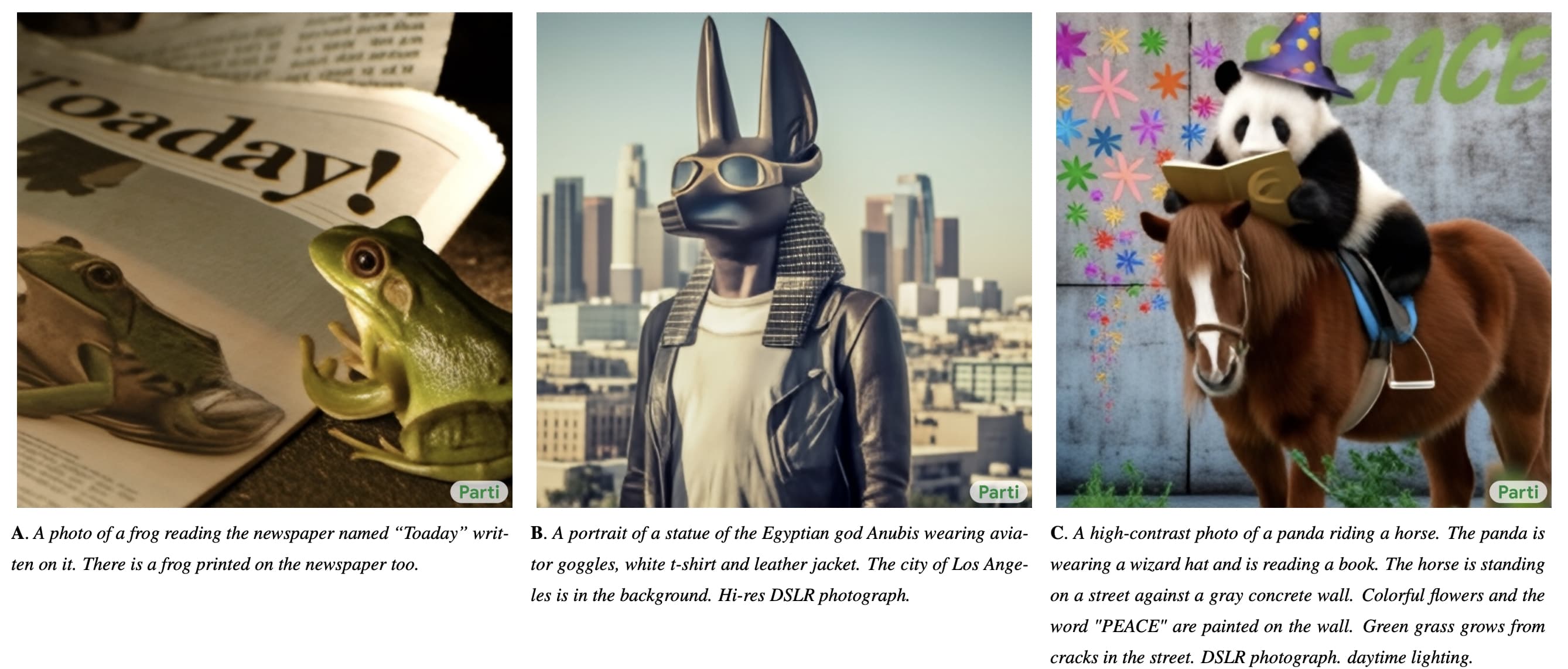 Pathways Autoregressive Text-to-Image (Parti) uses an autoregressive model that can “benefit from advances in large language models.” For comparison, Imagen uses Diffusion, where the model learns to convert a pattern of random dots into images.