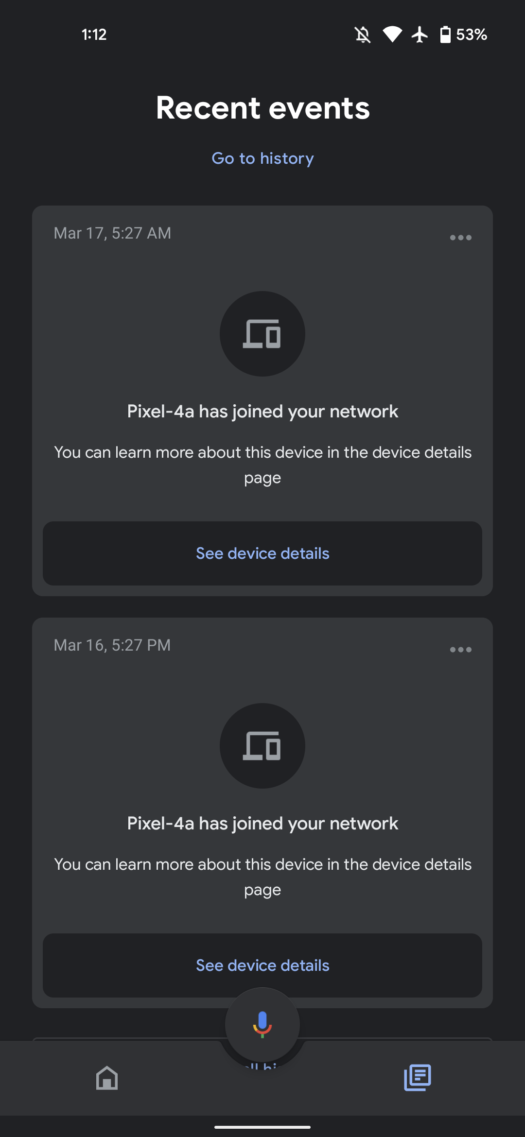 The goal of this redesign is to show more “Recent and relevant updates” by replacing the feed of cards grouped into several sections with a compact list – each smart home event is accompanied by an icon, one-line summary, day/date, and description.