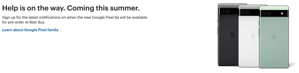 Interestingly, too, Best Buy is pushing some notable advertising around the upcoming release. If you search for “Pixel 5a” or even just “Pixel,” you’ll be greeted with a banner saying that “help is on the way.” The banner then allows users to sign up for notifications for when the Pixel 6a launches.