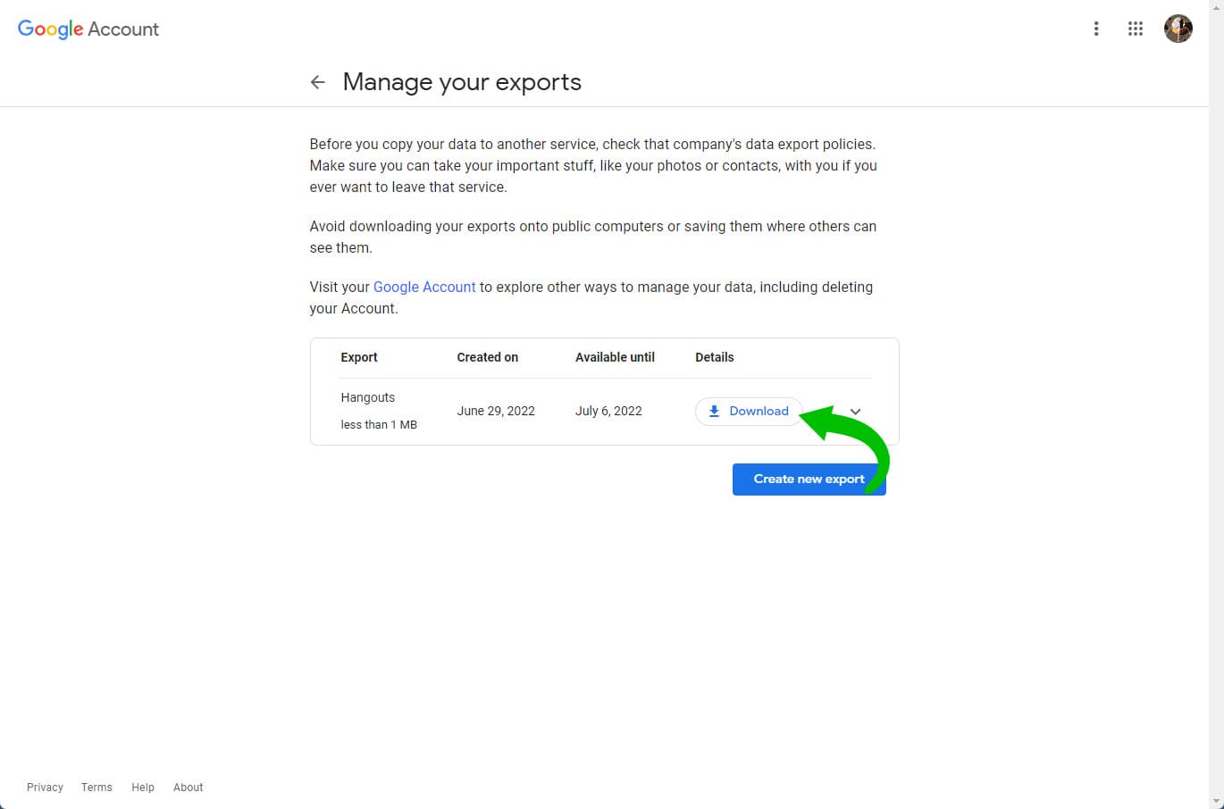 - Since this is likely one of the last times you’ll use Hangouts, leave Export once selected.