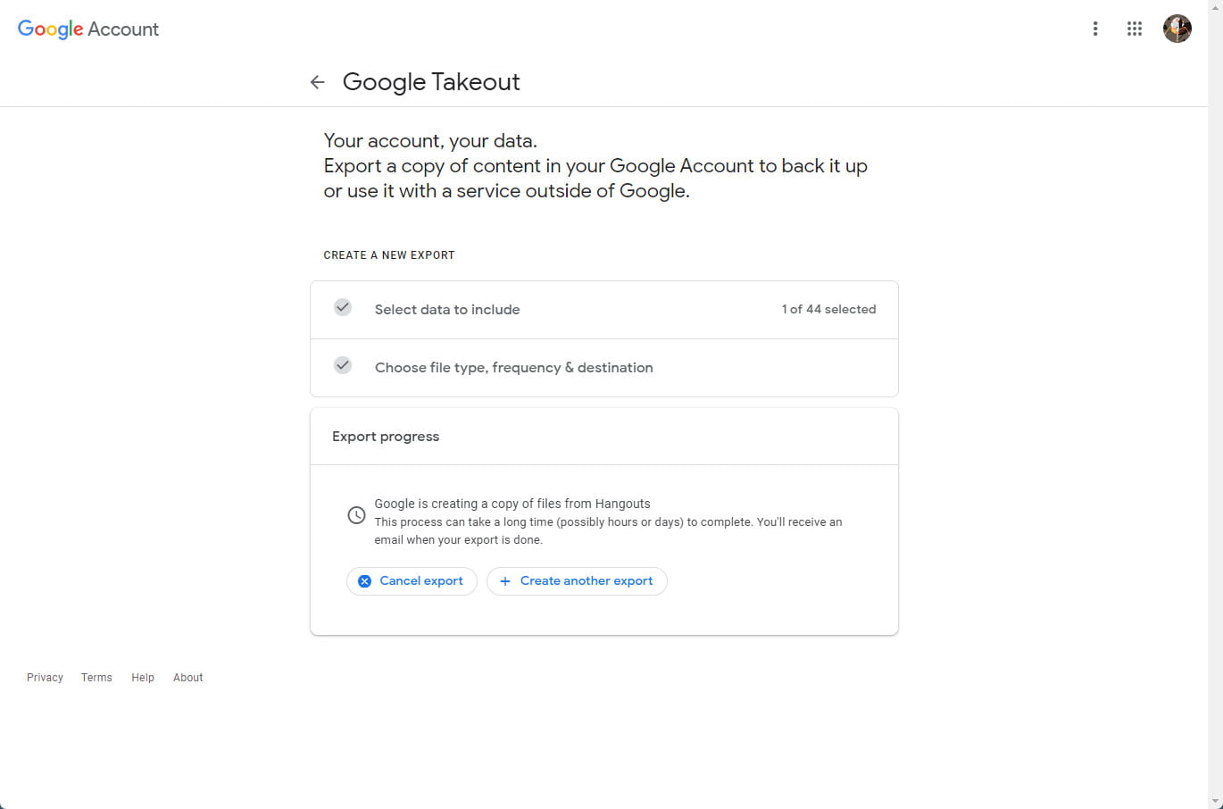 - Wait for Google to create an export file. This process could take hours or even days. This process is done server-side, so you can leave and check your email later on for the file.