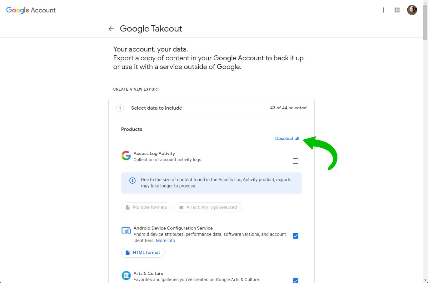 - Click Deselect all at the top since we only want to export Hangouts data.