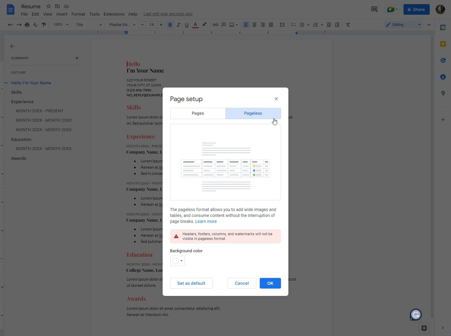 With Google Doc’s Pageless format, you still edit the text in those similar margins, but images and tables are able to expand past them. This makes them far easier to read and see. In addition, Pageless format gets rid of page breaks. Instead of empty spaces indicating a new page, you get an essentially infinite scroll of text and media.