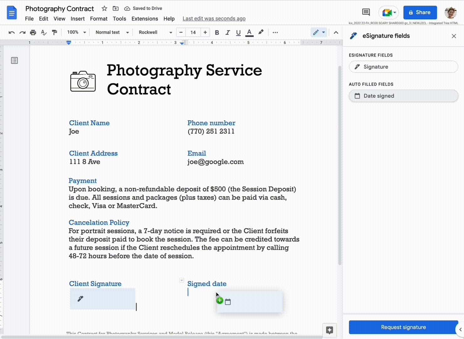 Google touts native eSignature support as letting you “quickly execute agreements from the familiar interface of Docs without having to switch tabs or apps.” You can drag and drop signature and date fields onto a text document. This capability has only been announced for and shown on the web client.