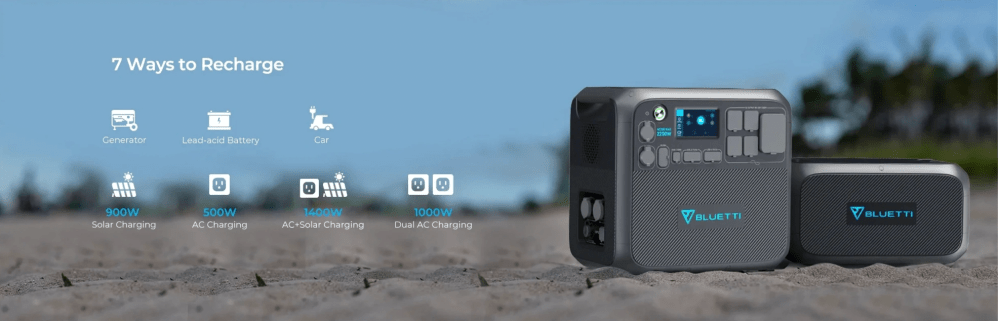• 7 Ways to Recharge (AC/Solar/Car/Generator/Lead battery/Dual AC/AC+Solar)