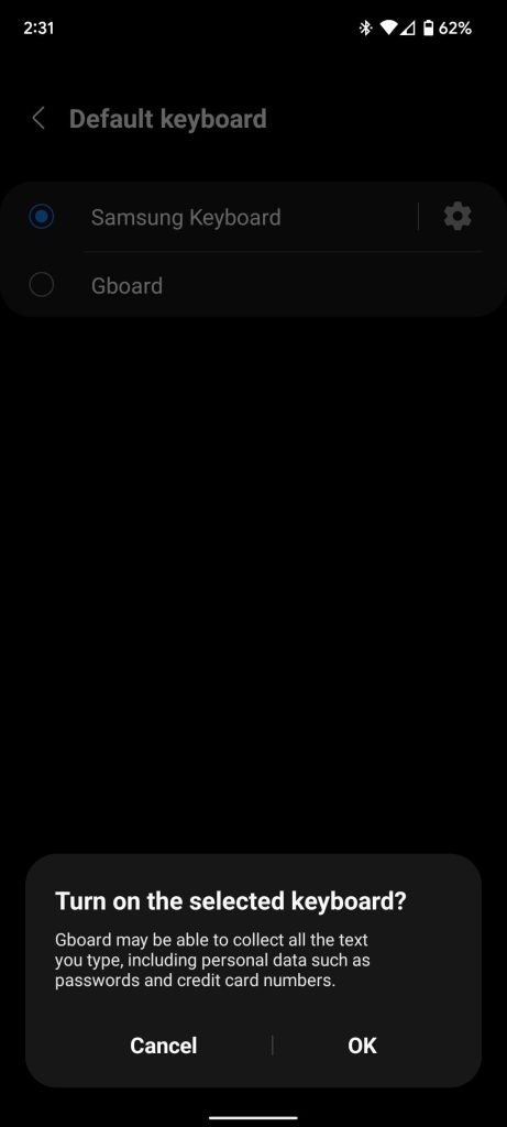- Hit Default keyboard and change it to Gboard.