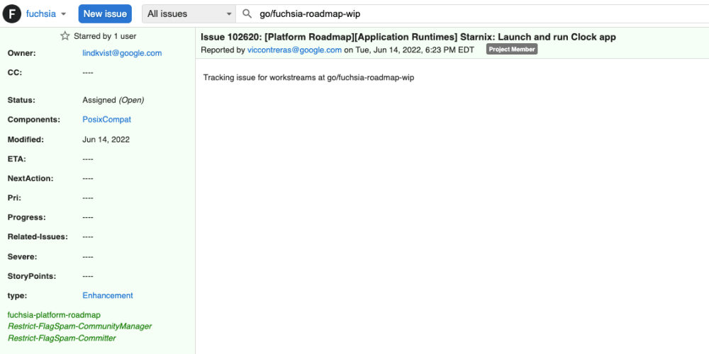 Another roadmap item from June points to Google’s desire to “launch and run Clock app” correctly in Fuchsia, which could potentially refer to the Google Clock app or possibly the open source “Desk Clock” from AOSP. This particular item was hidden from the public shortly after publication, but we’ve preserved a screenshot below.