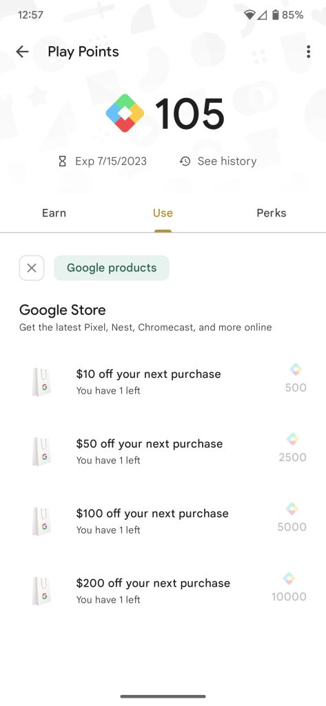 That aside, the Play Store is offering these Google Store discounts at surprisingly good rates. When redeeming your Play Points for Play Store credit, 100 points is equal to $1, but these new Google Store discounts work out to 50 points to $1. That means you can get $10 off with just 500 points, or if you’ve really been saving up, $200 off for 10000 points.