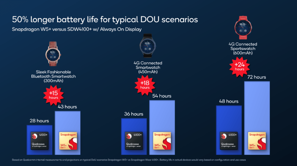 Qualcomm says that it came up with these estimates based on “internal measurements and projections,” so you should definitely expect actual Wear OS products using the Snapdragon W5+ Gen 1 to vary considerably in actual battery life.