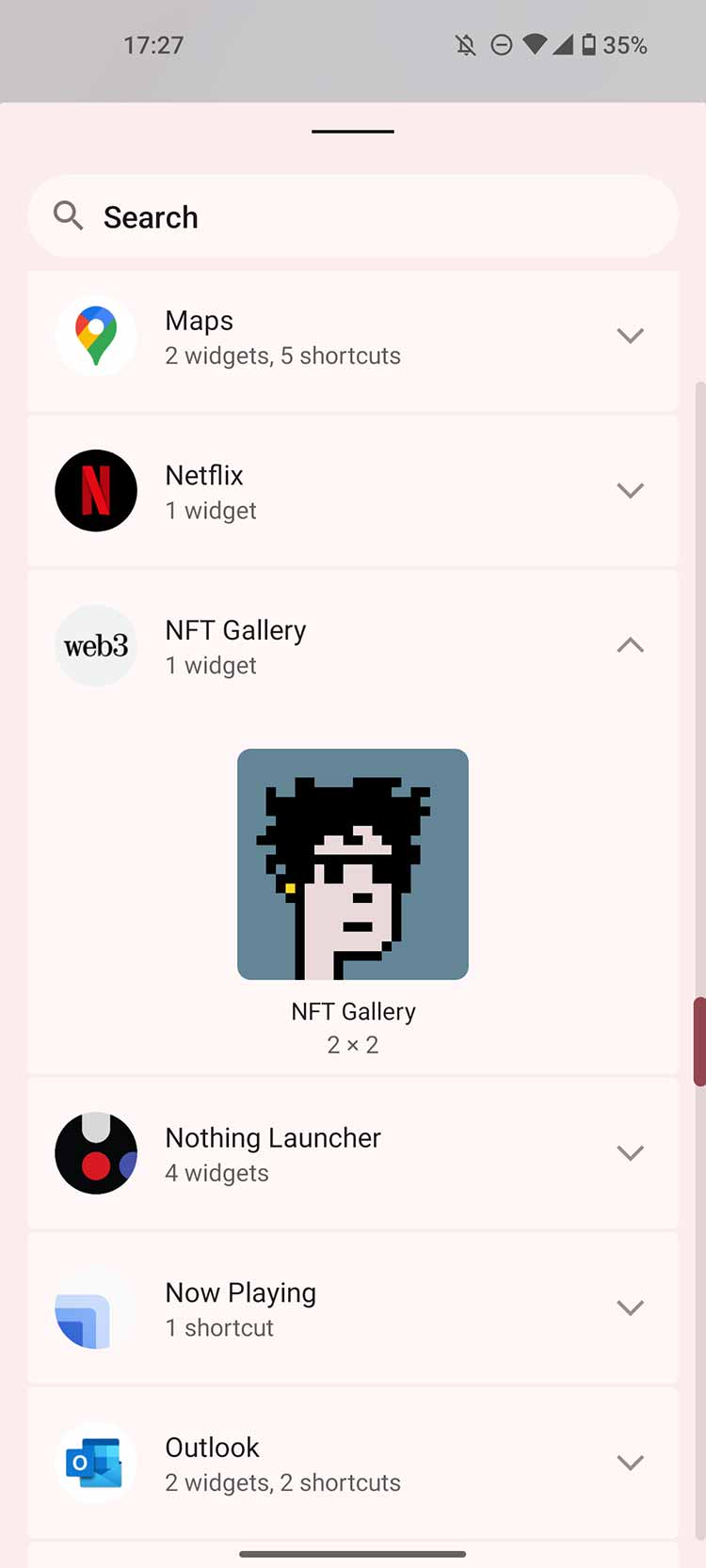 During the keynote, Carl Pei announced that there would be an NFT widget that connects to your existing accounts so that you can display the digital “art” right on your homescreen. After downloading the Nothing OS 1.1.0 update you should have a new “NFT Gallery” section within the widget panel. The placeholder image happens to be Pei’s own $310,997 Crypto Punk NFT.