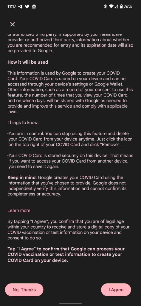 Once finished, a digital COVID-19 vaccine card will be available in Google Wallet for you to use if needed. Something to note is that this COVID-19 vaccine card is saved locally, meaning you’ll have to generate a new one or download it again if you switch devices.