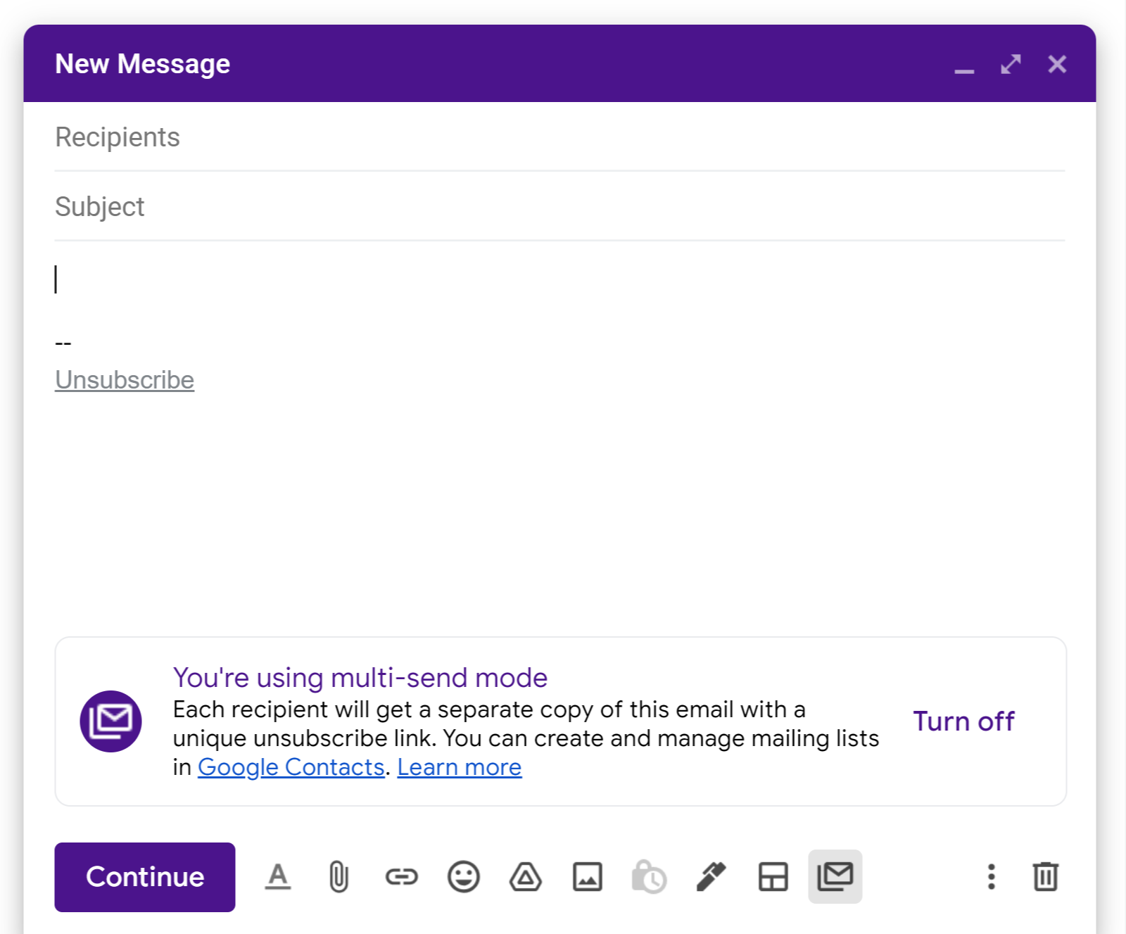Meanwhile, multi-send is an alternative to BCC-ing with all recipients receiving a separate copy of the email. Senders create and can manage mailing lists in Google Contacts.