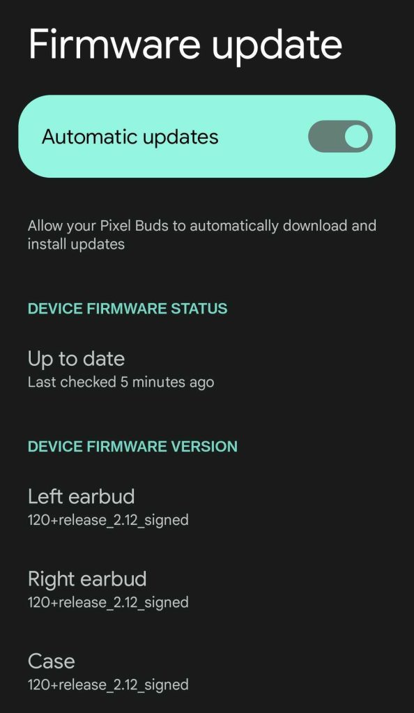 Pixel Buds Pro ship with an out-of-date firmware version, v73. Out of the box, most users should see a day-one update to firmware version v120 – specifically 120+release_2.12_signed – for each individual earbud as well as the charging case.