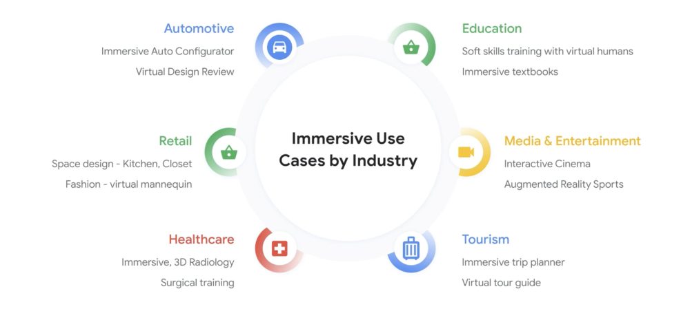 Use cases today primarily cover product demos, especially for cars as virtual showrooms. Others cover shopping, tourism, and even kitchen remodeling. Looking ahead, Google offers many more examples, including training, across different categories.
