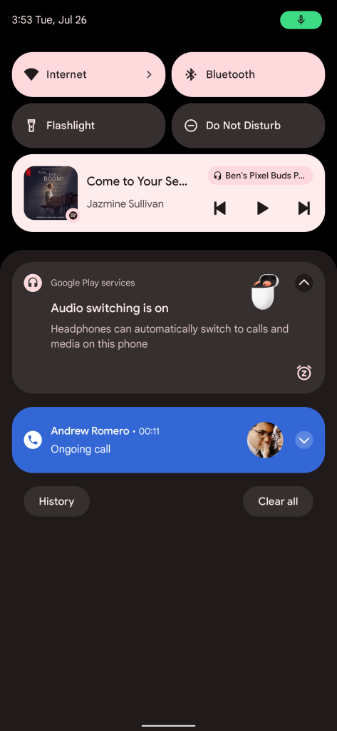 The key use here is if you’re listening to music or watching a video on one smartphone or tablet, and get a phone call on another. In our limited testing of this feature, it works incredibly well. While paired to a Galaxy Z Fold 3 and listening to Spotify, the Pixel Buds Pro immediately switched over to my Pixel 6 Pro as it was receiving a phone call. It was absolutely seamless, and I was able to resume playback from the Fold as soon as the call was complete.