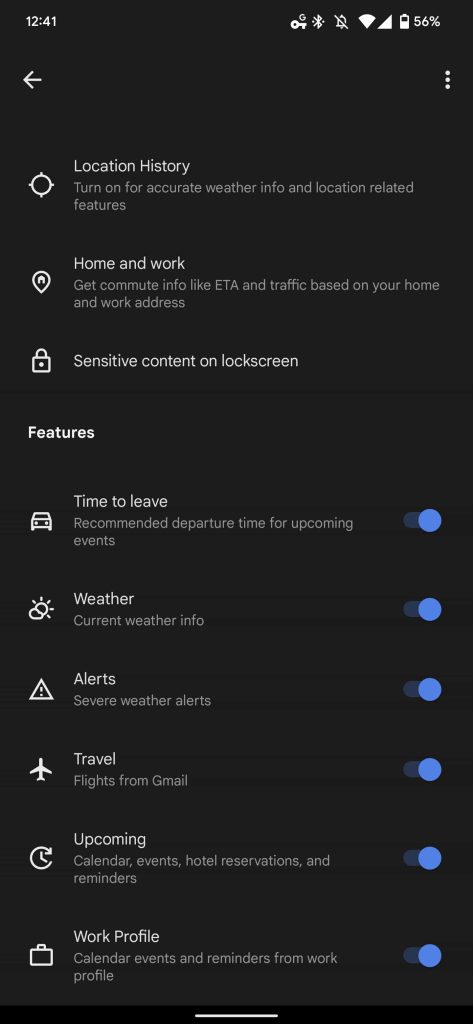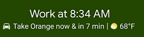 This feature shows “Traffic info and travel time” based on your set home and work addresses. It might suggest what public transportation to take and how long it will take for you to arrive, with a tap opening Google Maps. It’s different from “Time to leave,” which is based on Google Calendar events.