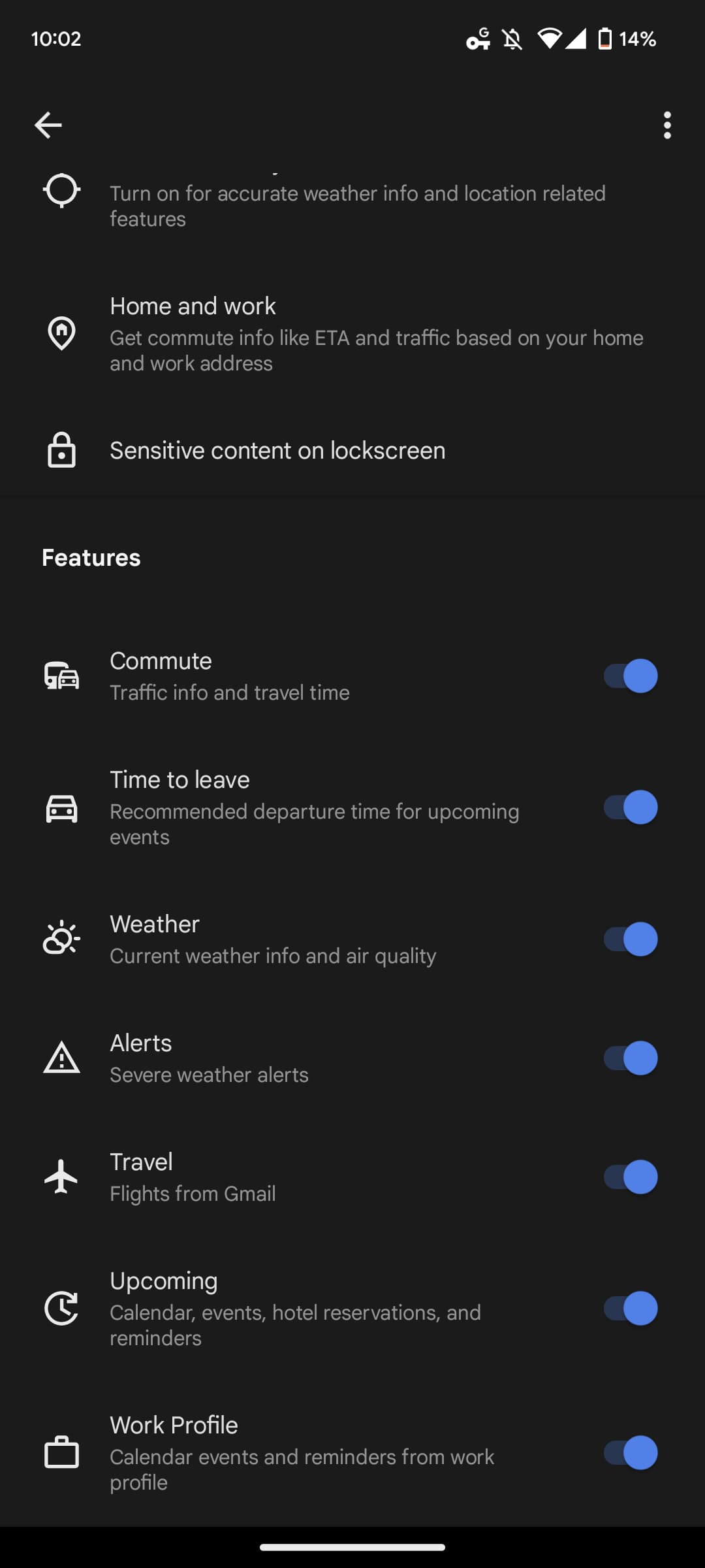 If you open Google Assistant settings (or access via Pixel Launcher preferences > At a Glance gear icon > See more features), you’ll notice that “Commute” is now the first toggle. Its appearance in the old At a Glance features list, which is now up to seven features, is telling. [Note: The “Weather” toggle recently incorporated “air quality” (AQI) warnings.]