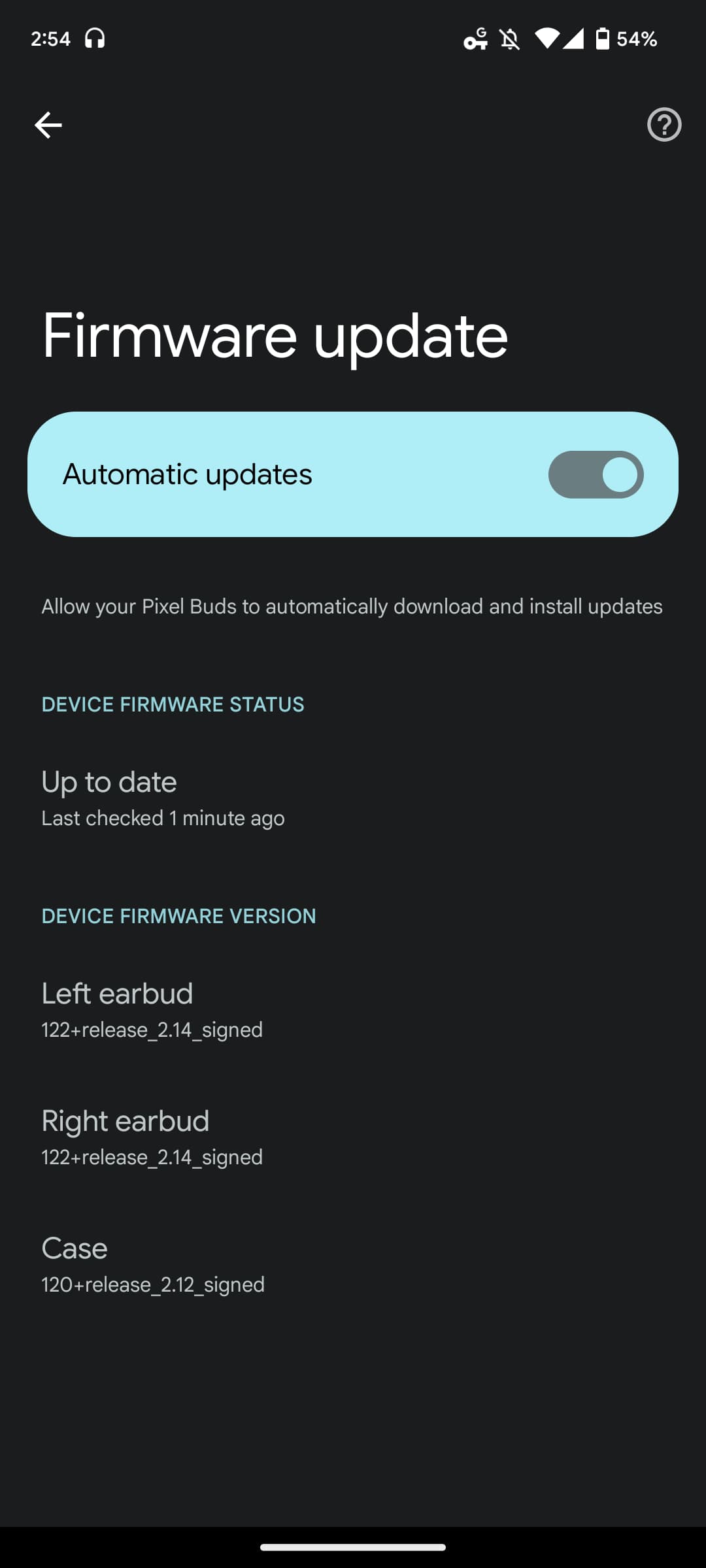 Open the Pixel Buds app/preferences and navigate to More settings > Firmware update. A “Manual update available” from 120+release_2.12_signed to 122+release_2.14_signed should be available for the Pixel Buds Pro. (Google in last week’s support post referred to updates using the latter sequence rather than the beginning digits, which could get unwieldy as the product matures.)