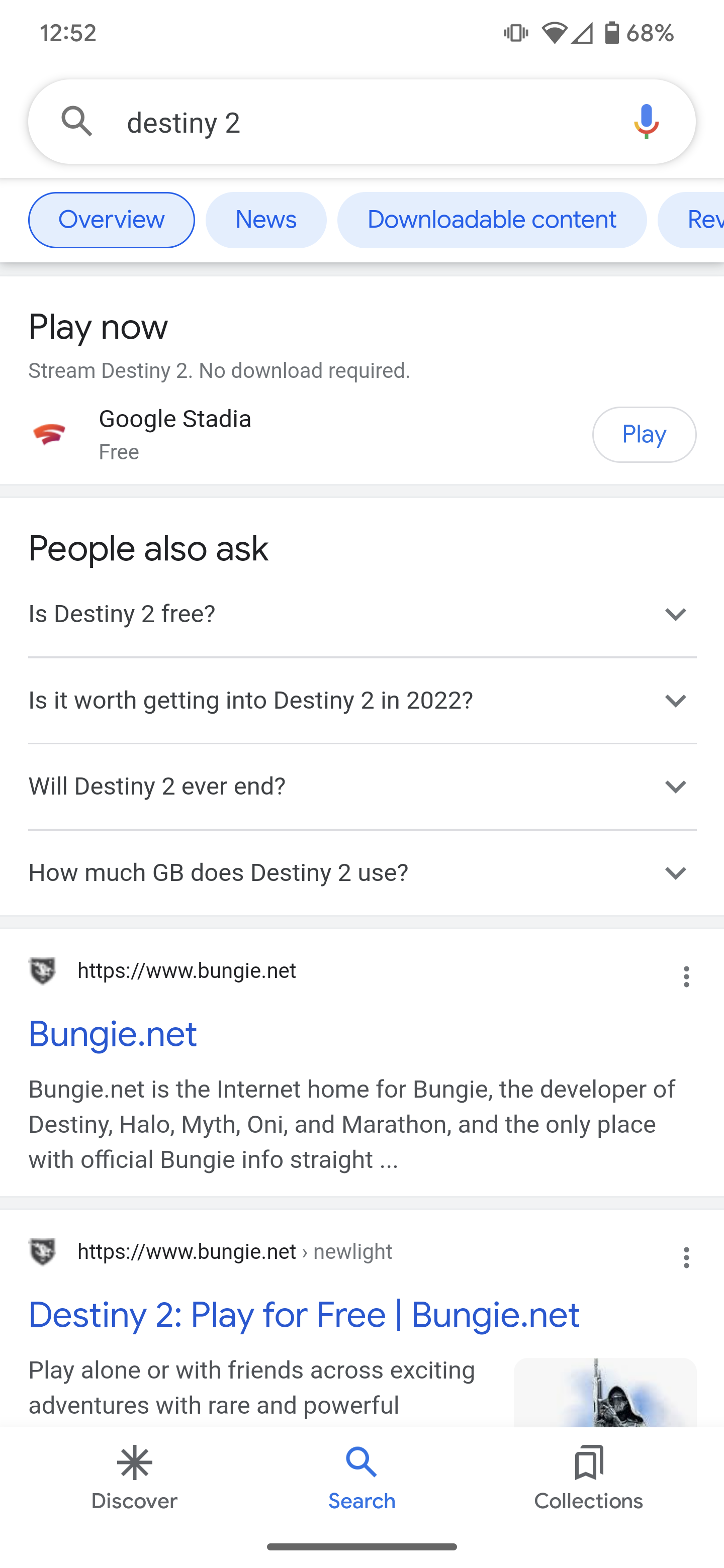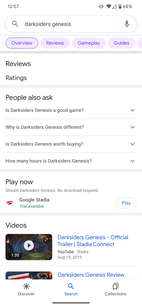 But that’s not to say Stadia isn’t getting a tiny bit of special treatment. On mobile, when a game has a free trial through Stadia, the page switches the text from black to green to show “Trial available.” Otherwise, Google Search simply shows when a game is “Free” (like Fortnite on Xbox, or Destiny 2 on Stadia) or if you can only stream it with a “Premium subscription” (as is the case for games on Luna).