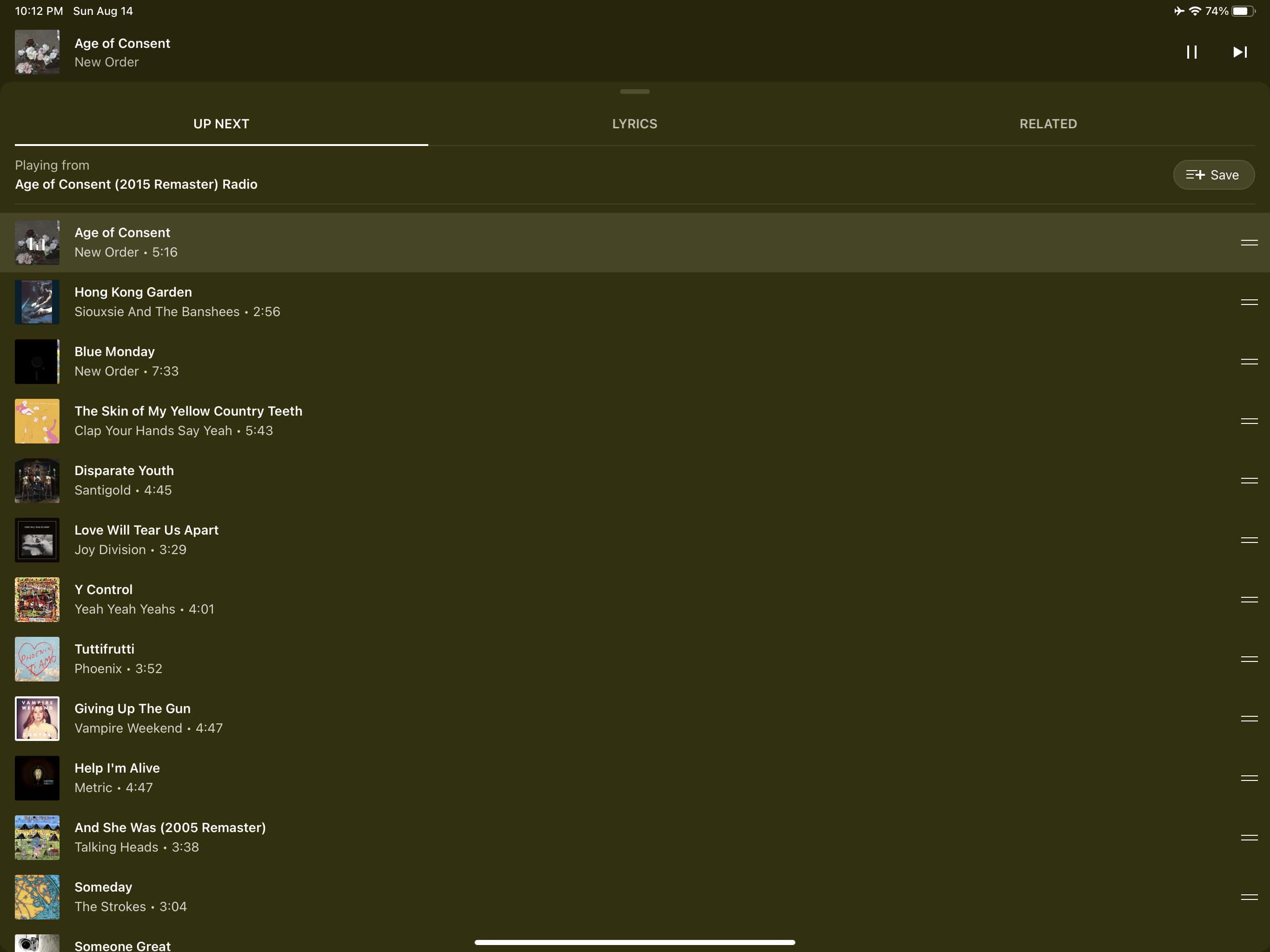 You can swipe up or tap for the Up Next queue, while Lyrics and Related (which offers a great browsing experience on large screens) round out that bottom row. Compared to Android, you unfortunately cannot swipe on cover art to move through songs.