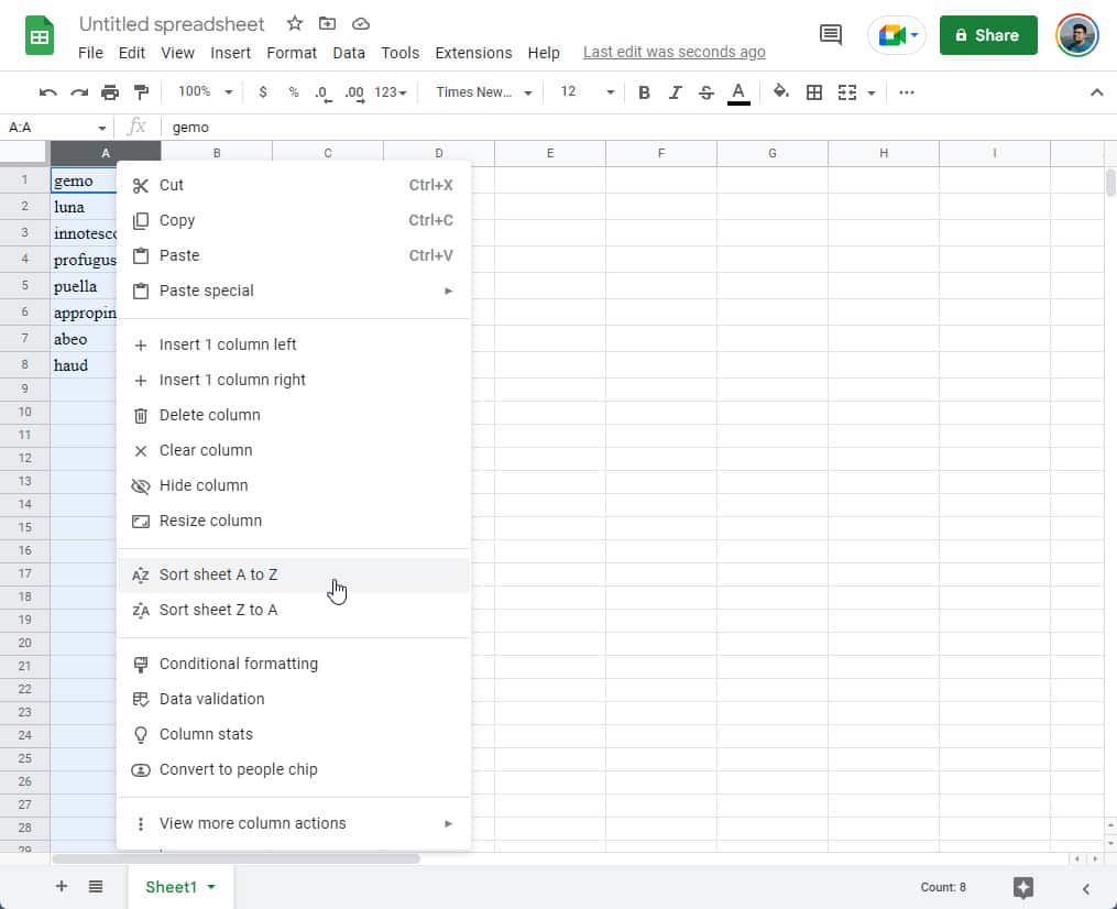 - Choose either a column or row you want to alphabetize in Google Sheets. Right-click the letter or number that corresponds.