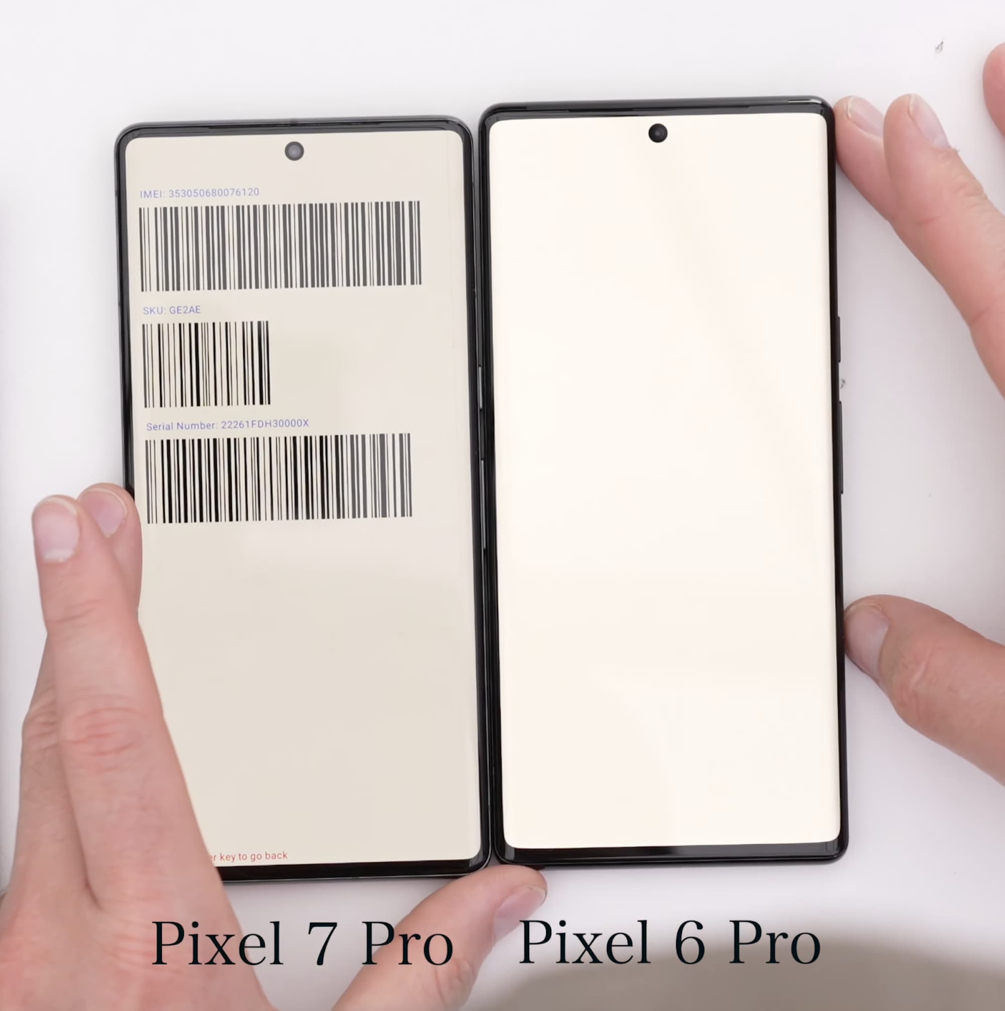 We next see the phones side by side and how the Pixel 6 is taller than the Pixel 7, which has slimmer minimal bezels. The Pixel 6 is 74.92mm wide (when measured with calipers) and weighs 205 grams versus 73.20mm on the 7 and 195 grams.