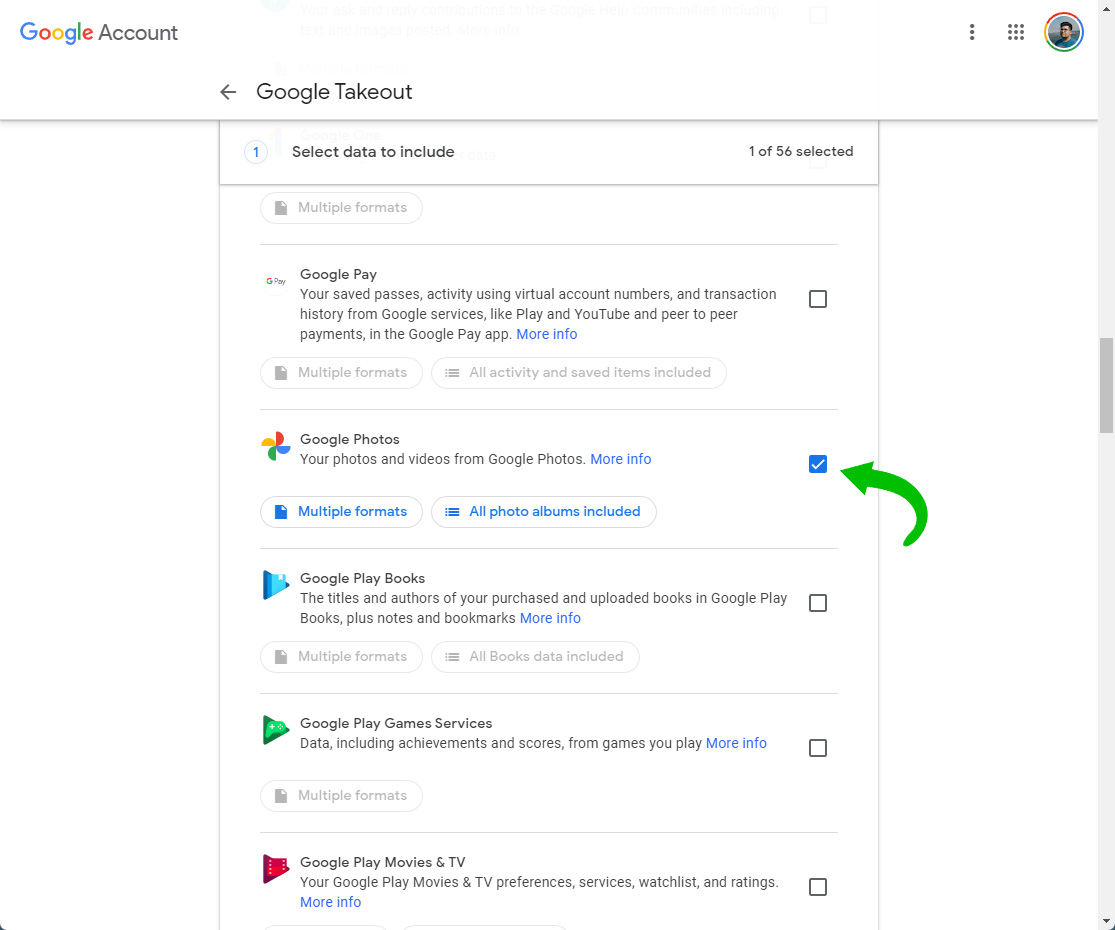 - Scroll down until you see Google Photos and hit the checkmark next to it.