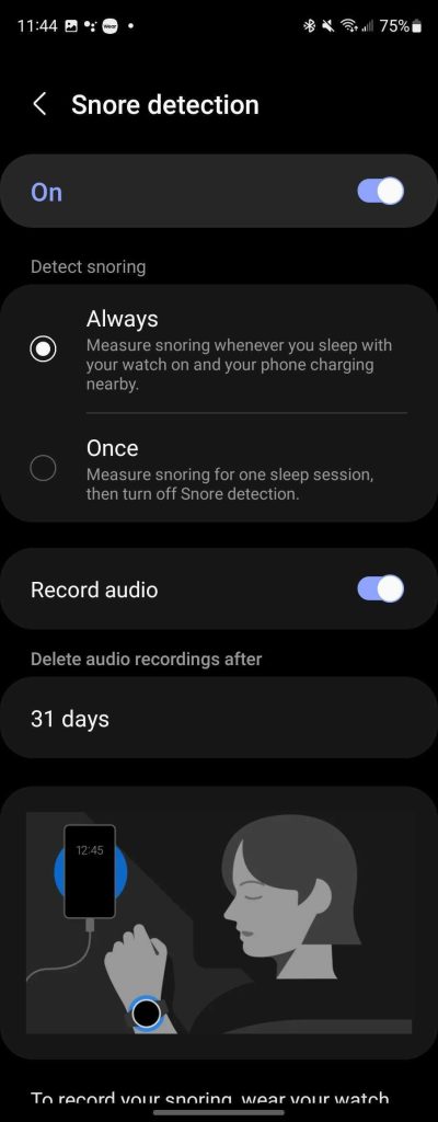 The only thing that may have a bigger impact on this watch is the thicker design, which as mentioned Samsung claims should help let the sensor make better contact with your skin and, in turn, better results. Whether or not that’s true, I don’t think can be noticed quickly. Sleep tracking also gets a slight boost with on-device snore detection – great to see, but still not particularly if you sleep with a partner or even pets. It caught “me” snoring on a few occasions, but the recording makes it hard to hear.