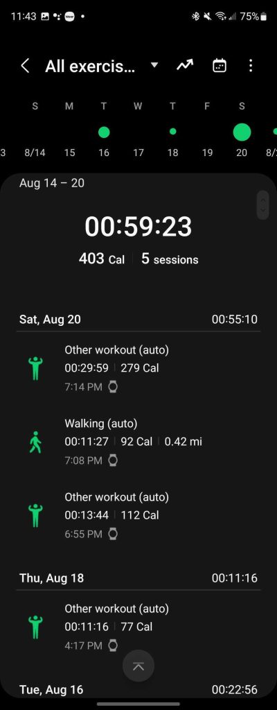 Usually, I’d start the day with the 44mm Galaxy Watch 5 with between 60-80% of capacity, and end with between 20-30%. My daily use generally consists of notifications, hundreds of them, while tracking heart rate 24/7, being used for overnight sleep tracking, and tracking a handful of walking workouts throughout the week. My primary workout is a round of disc golf 2-4x a week, which triggers the walking workout on Samsung Health – that workout also comes with using the Watch 5 for scorekeeping using the UDisc app. The overall drain I see with those activities is around 40-50% per day, and up to 70% if I throw any form of GPS tracking in, whether that be a workout or Google Maps. With always-on display in the picture, I found that a full day plus sleep tracking brought the watch to around 35% by morning, which is acceptable in my book.