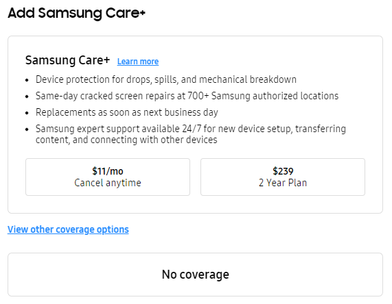 Samsung Care+ appears when checking out on Samsung.com – the offer is only available for purchases through Samsung.com – but that block advertises the service at its full cost, with absolutely no mention of the free year promotion.