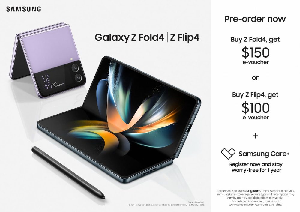 Customers who pre-order either Galaxy Z Flip4 or Galaxy Z Fold4 will receive one complimentary year of Samsung Care+, delivering protection against drops or cracked screens with Samsung expert support in select countries.