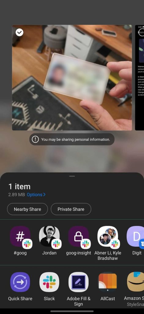Another new feature is Privacy Detection. Samsung says that Privacy Detection scans photos on your phone before you share them and recognizes sensitive data such as passports, IDs, credit cards, and more. In quick testing, we were able to trigger the notice on a driver’s license, with a notification alerting that “you may be sharing personal information.” It doesn’t redact information automatically (we did so ourselves in the example below, for privacy’s sake), but it’s a nice addition nonetheless!