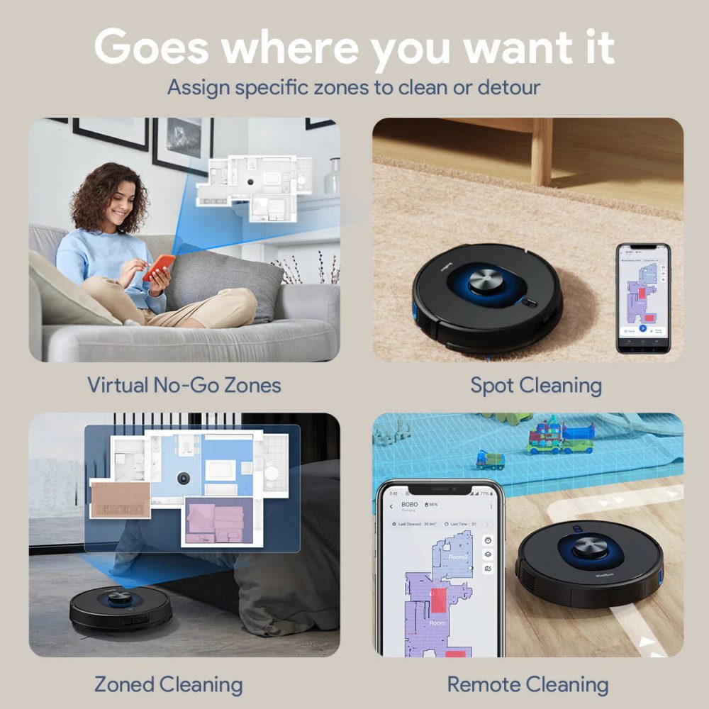 Once you let the Shellbot SL60 get to work, its AI system is able to use the sensors to intelligently map out the rooms of your home. Through the Shellbot app, you can configure “no-go areas” that the vacuum will avoid. The same app allows you to choose which rooms should be cleaned or even set up an automatic cleaning schedule for your home.