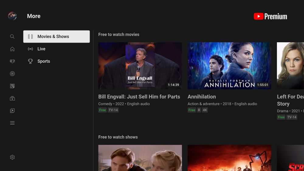 You’ll find Movies & TV Shows, Live, and Sports under this new section. Movies & TV Shows existed in its own sidebar tab previously, as did Live. Sports appears to be an entirely new addition, perhaps related to YouTube’s recent dabble in streaming live MLB games.