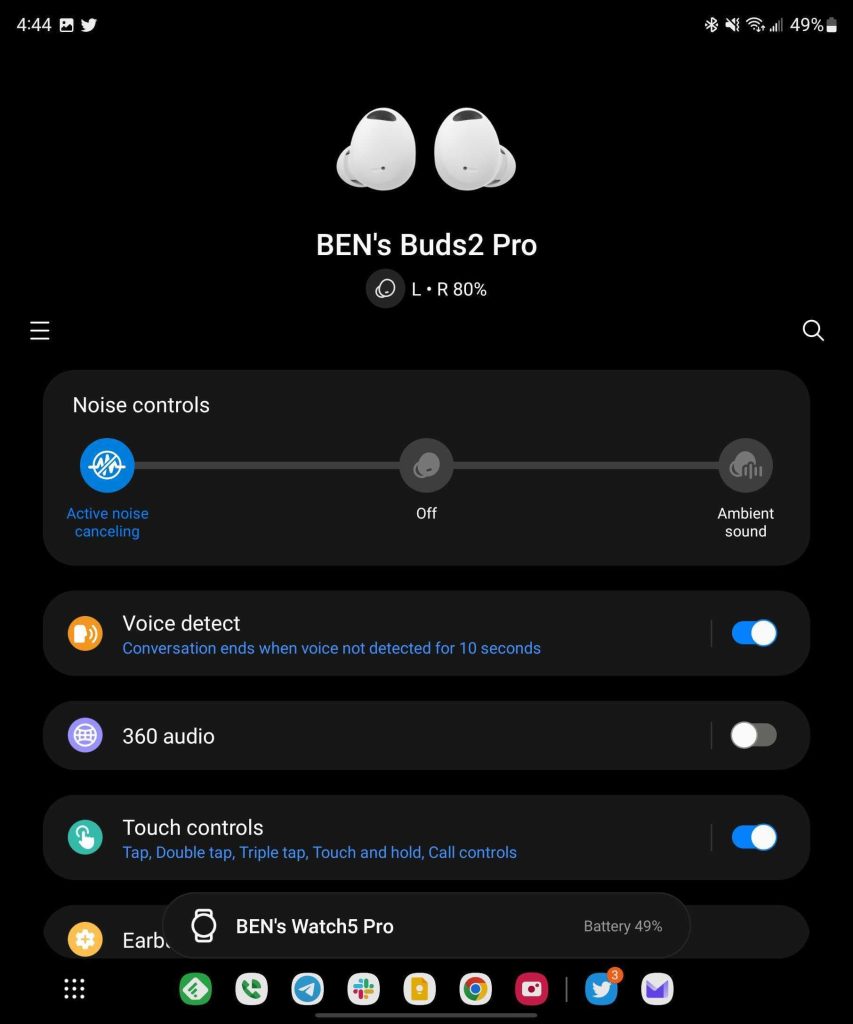 The Galaxy Buds 2 Pro sound great, don’t get me wrong, but they’re not that much better than most other earbuds at this price point. You might pick up on some background sounds that other earbuds couldn’t accurately replicate. Listening to “If It All Goes South” by Sammy Rae & The Friends through Spotify on its highest quality settings (320 kbps), I definitely picked up on some background sounds better than through my Pixel Buds Pro. “Come to Your Senses” from Tick Tick Boom has been my go-to test this year for earbuds, and Galaxy Buds 2 Pro definitely pass with relative ease. I felt the highest notes were approaching “shrieky” territory, but it was still a pleasure to listen to overall – one of the better models I’ve tested so far this year.